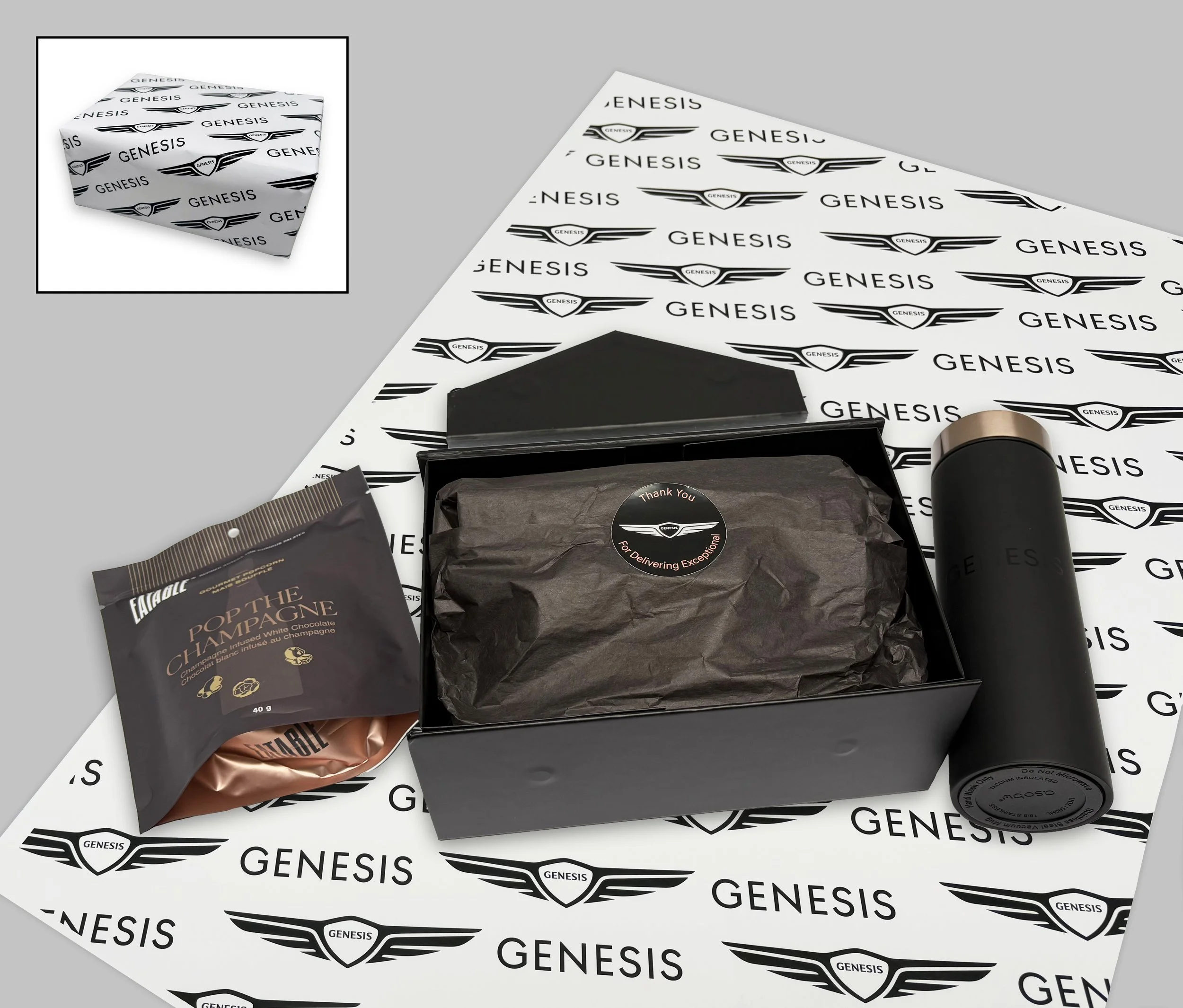 Wrapped in tissue, sealed with a bespoke sticker, and personal note and presented in a reusable magnetic-close box, the gift felt premium from the start. We finished it off with Genesis-logoed wrapping paper - strong enough to ship in, so the branding and anticipation began the moment the package landed in their hands.