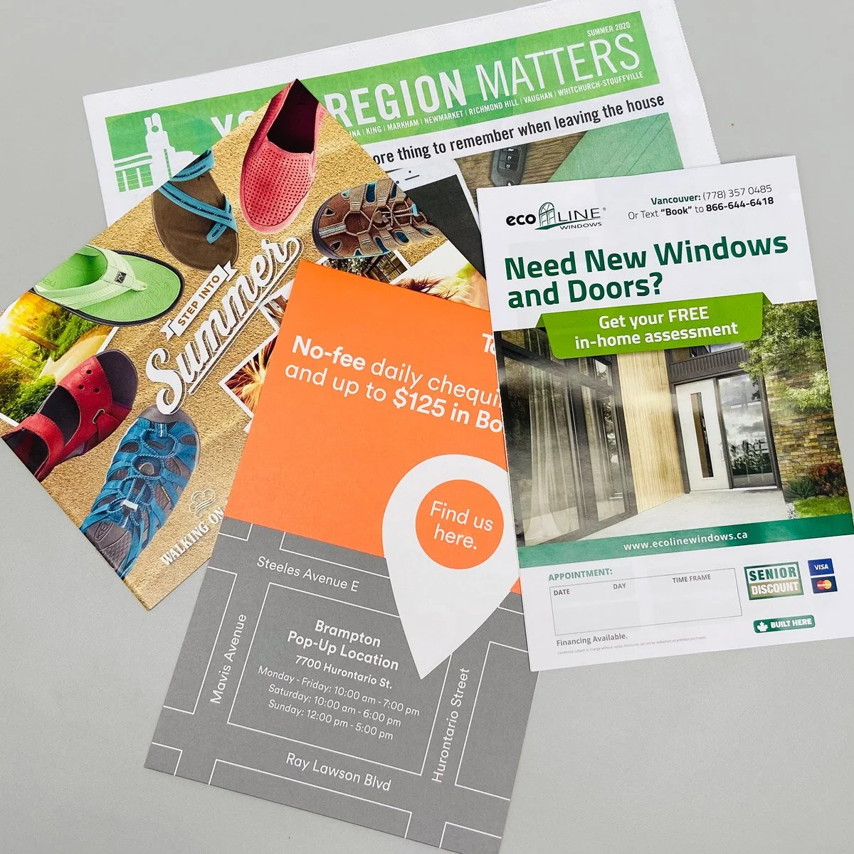 Flyers promoting restaurants, home improvement, lawn care, dentists, retail sales municipal newsletters, activity guides and recycle and garbage schedules